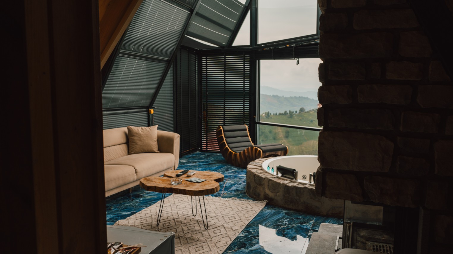 -Cam tavanlı dublex bungalovumuz jakuzili ve şömineli olup muhteşem dağ ve deniz manzarasına sahiptir.