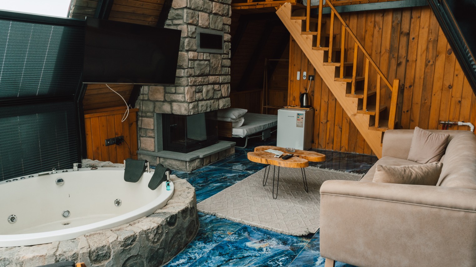-Bungalovumuzda, jakuzi, oturma grubu, şömine, banyo, tv(Netflix), minibar ve double(çift kişilik) yatak bulunmaktadır.