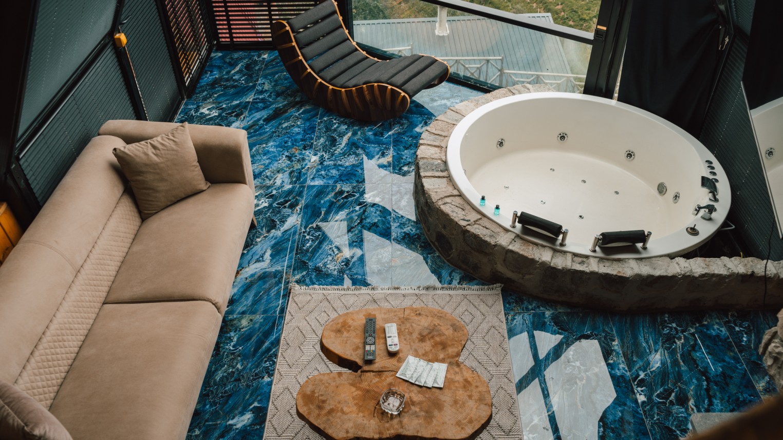 -Cam tavanlı dublex bungalovumuz jakuzili ve şömineli olup muhteşem dağ ve deniz manzarasına sahiptir.