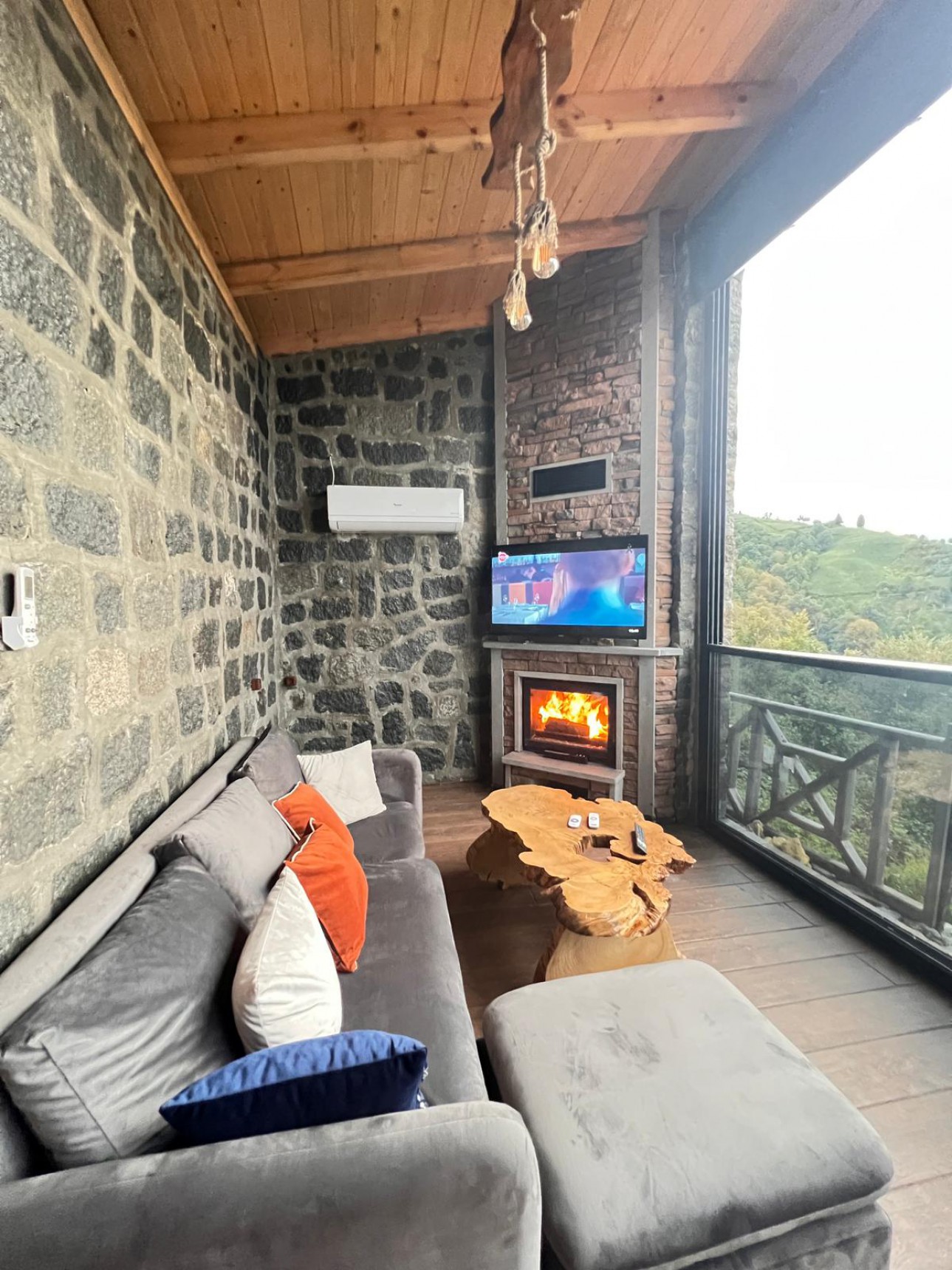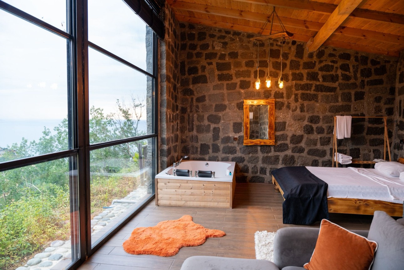 -Taş bungalovumuz jakuzili ve şömineli olup muhteşem dağ ve deniz manzarasına sahiptir.