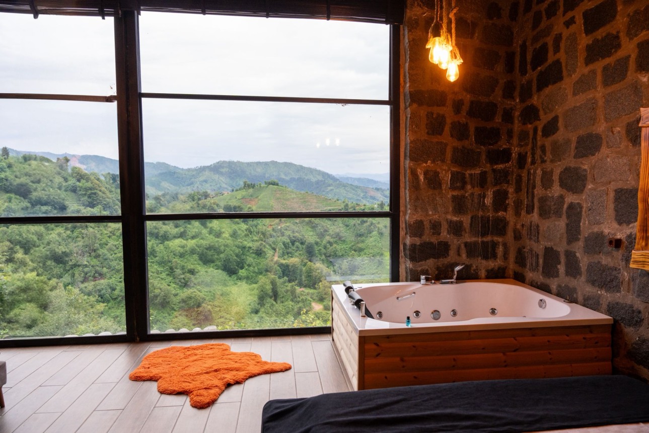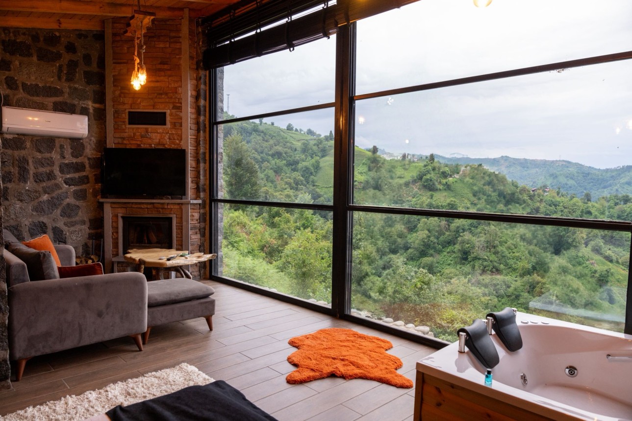 -Taş bungalovumuz jakuzili ve şömineli olup muhteşem dağ ve deniz manzarasına sahiptir.